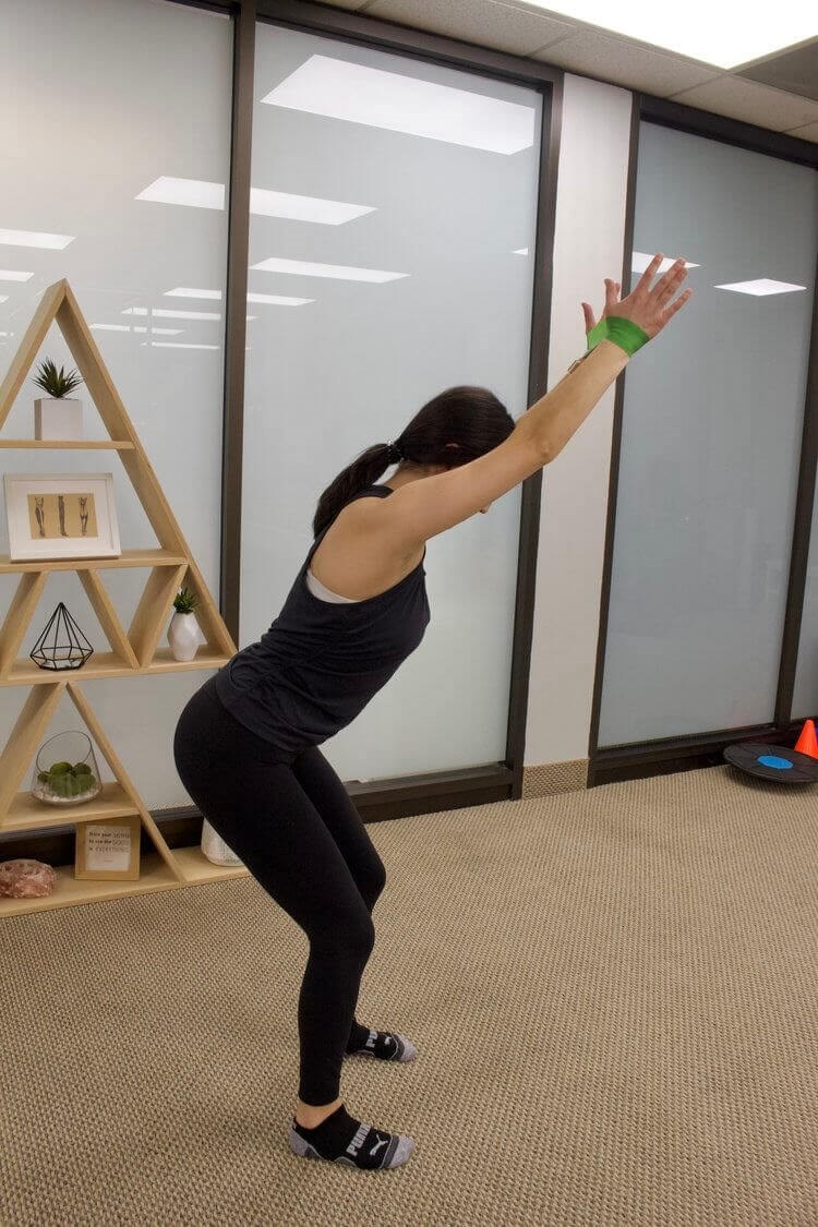 - Hinge at the hips slightly with a bend in your knees. Your arms go up overhead, be mindful to keep your shoulders rolled back and core engaged. Your gaze is straightforward.