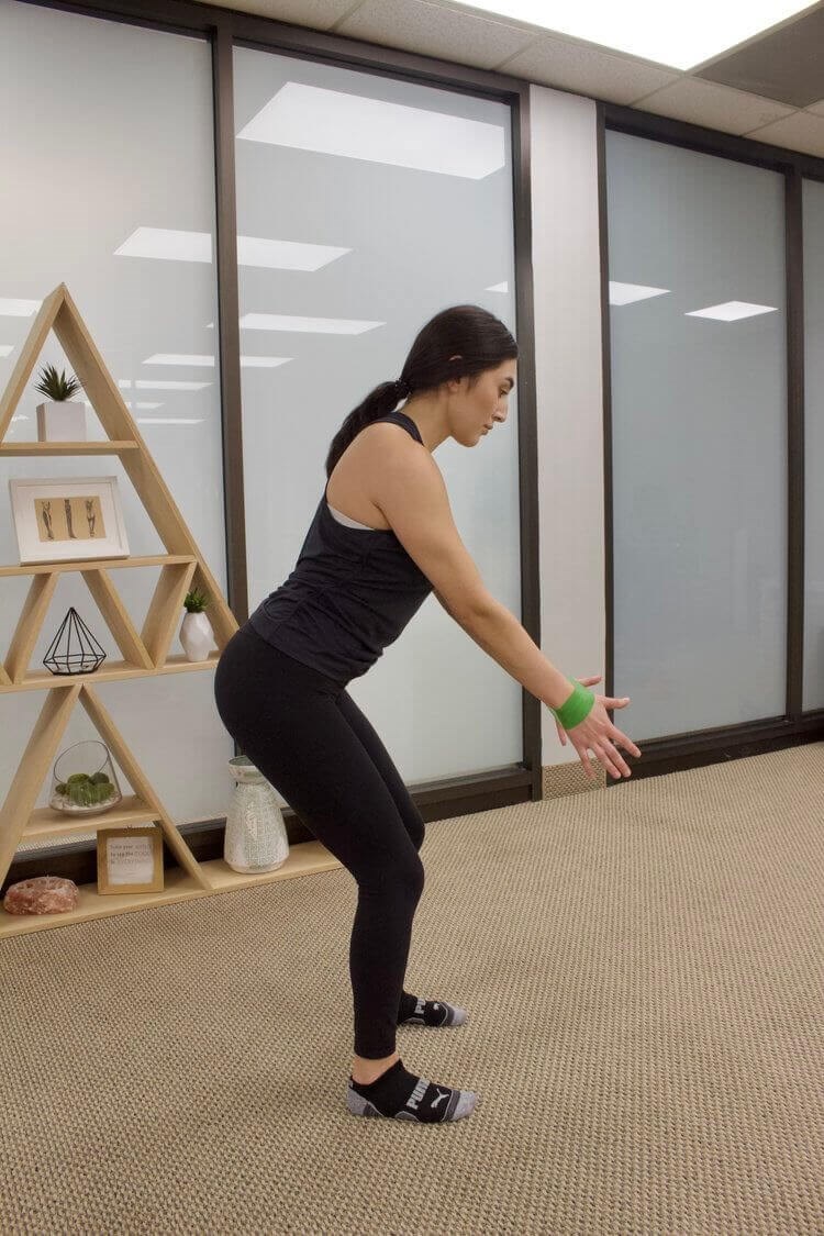 - Begin the squat by pushing your hips back and bending your knees. Imagine sitting back into a chair.