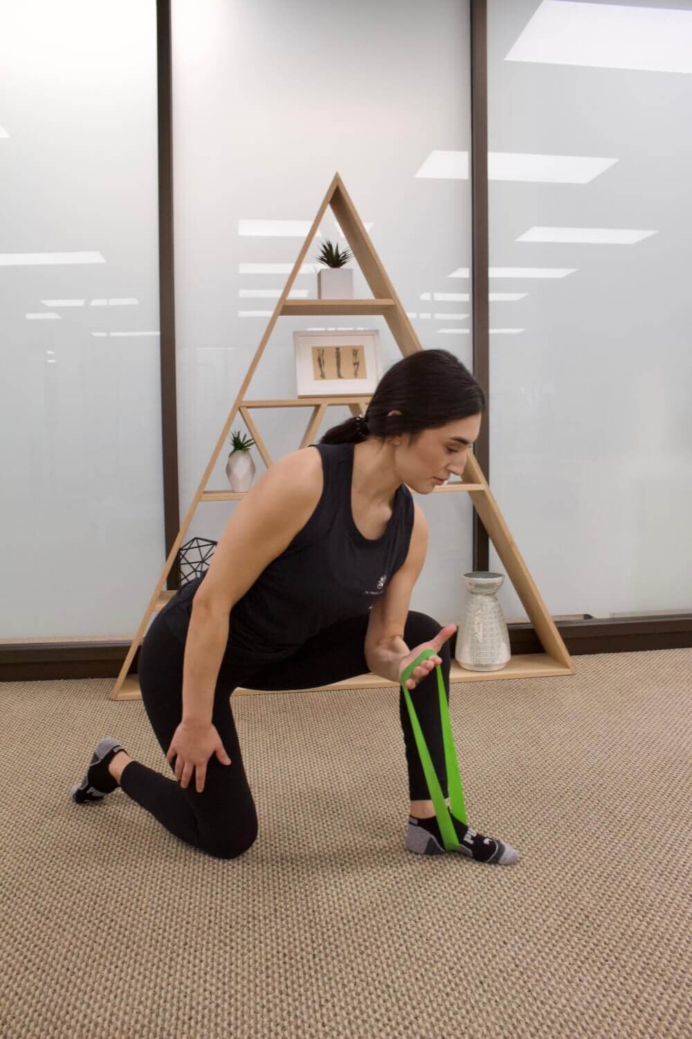 - Kneel on the floor with one leg forward and one leg back. Place one end of a mini resistance band under you the arch of your foot and the other hand around your palm.