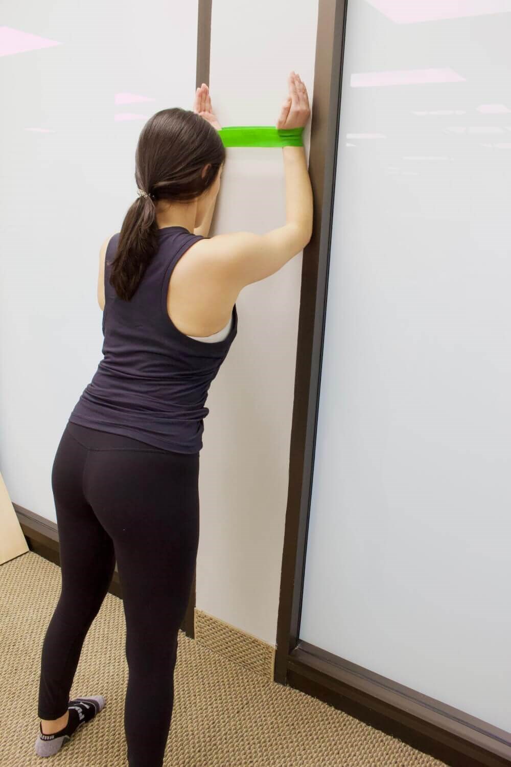 - Stand facing a wall with your feet hip-width apart. Place a resistance band around your wrists.