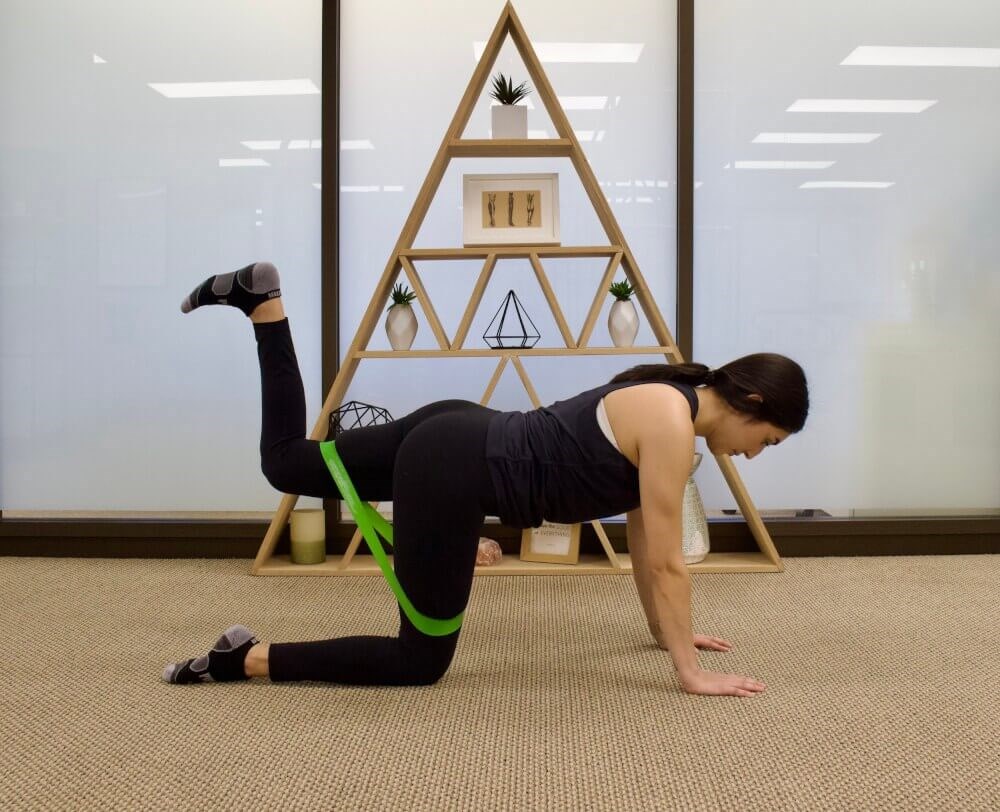 - Place a band just above your knees. Begin on your hands and knees in a tabletop position. Ensure that your wrists are directly under your shoulders and your knees are under your hips.