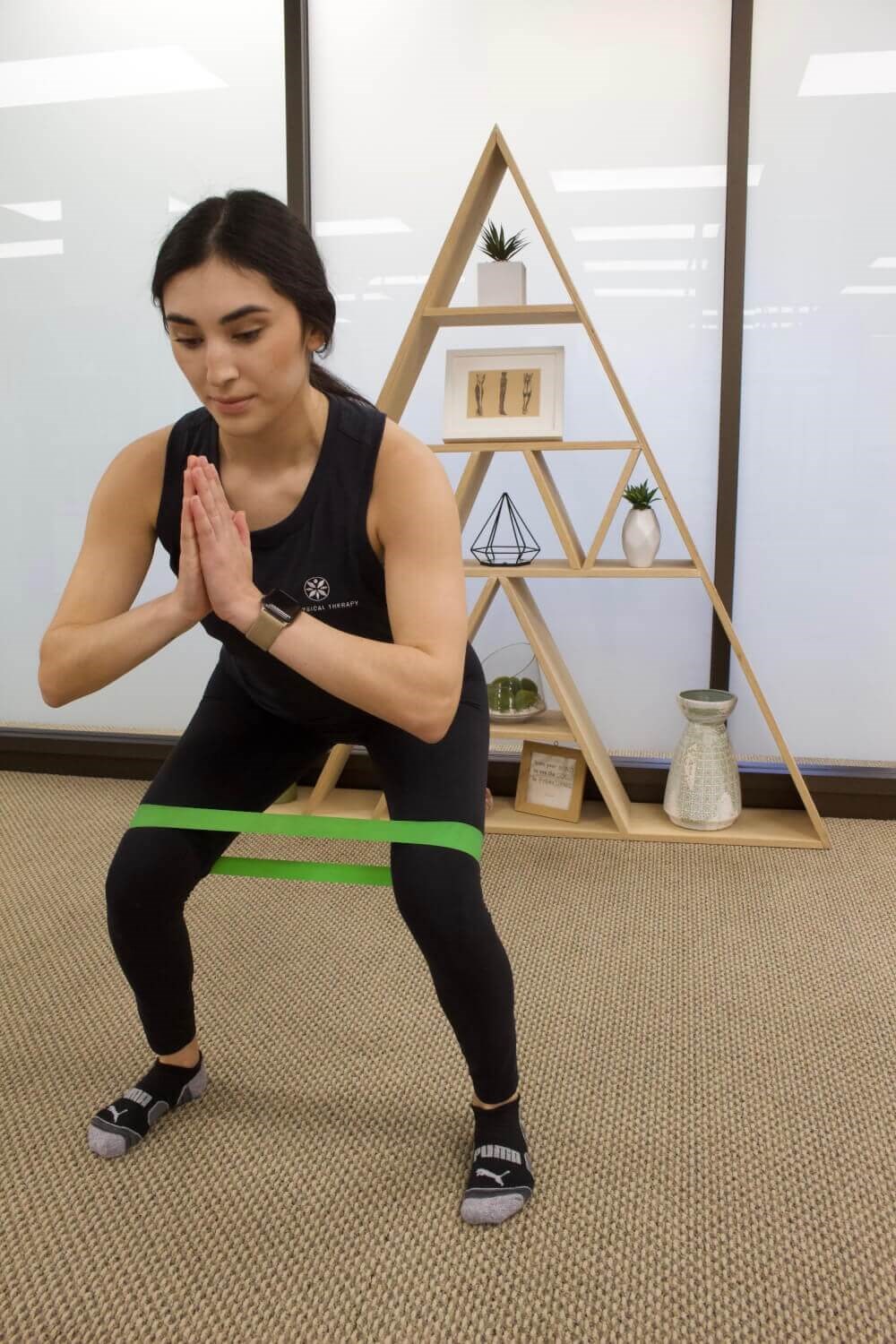 - Ensure that your knees are aligned with your toes as you lower your body. The mini band will provide resistance, activating your hip muscles.